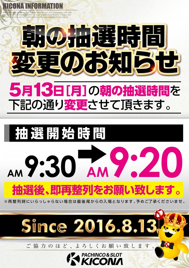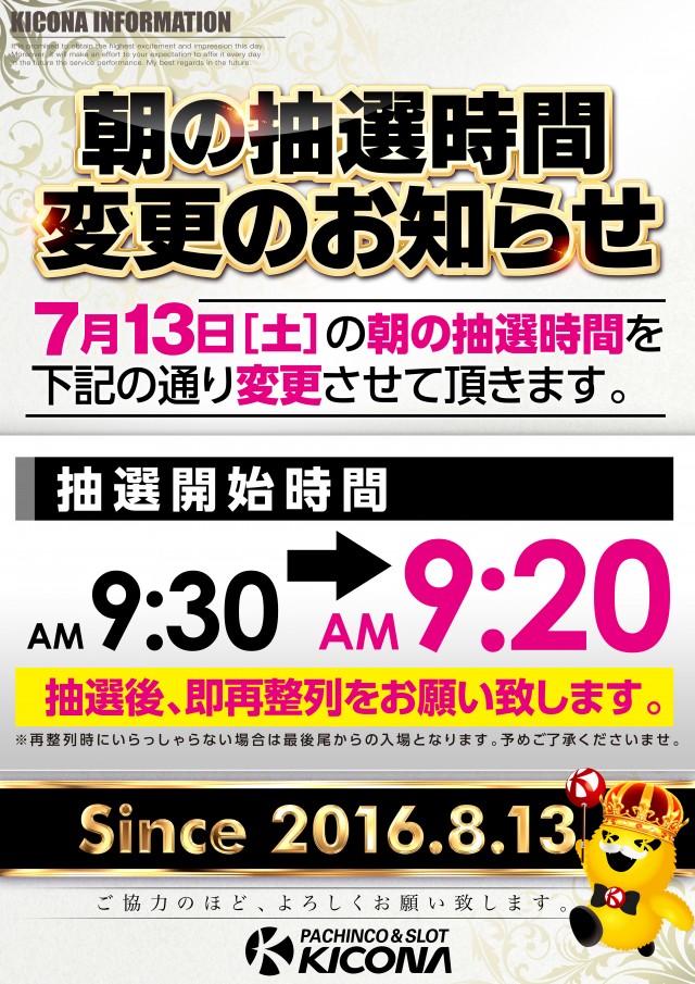 9:45~シャッフル抽選開始 9:55分~再整列 10:00~入場 |