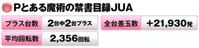 いずれも2台設置と数は少ないが、プラス台数・全台差玉数共にハイレベル。『Pとある魔術の禁書目録JUA』は粘り切っての出玉GETが平均回転数から読み取れる。
