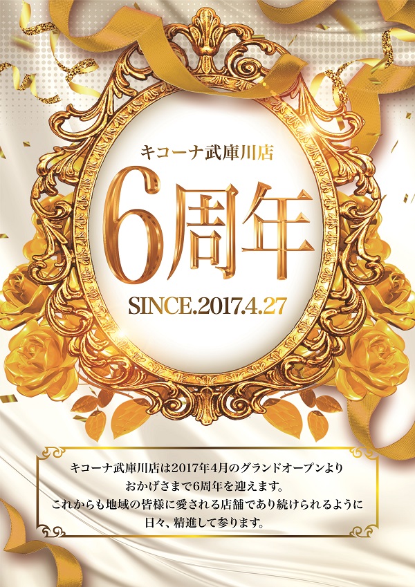 こんばんは!本日4月27日(木)AM1⃣0⃣:0⃣0⃣ open✨✨✨SINCE.2017.4.27✨✨✨キコーナ武庫川店はグランドオープンよりおかげさまで6周年を迎えます。