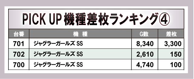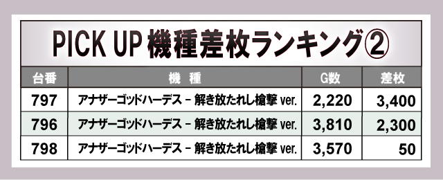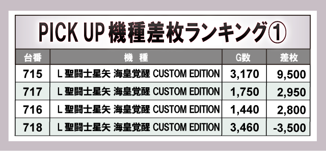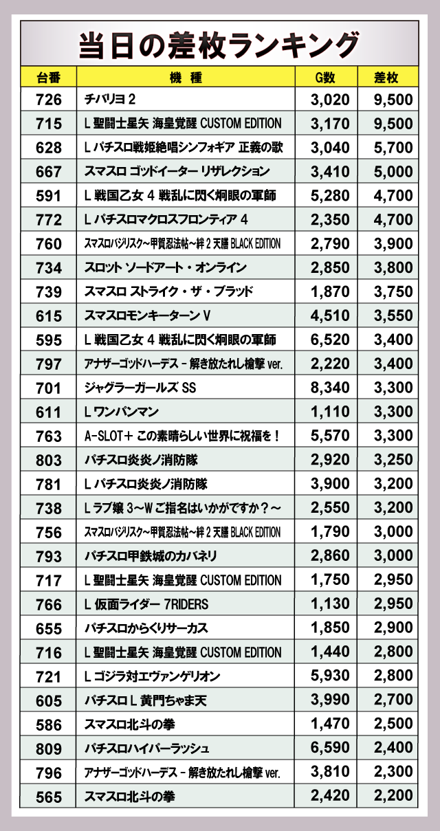 上表で取り上げた機種は、いずれも活気と熱気に満ちたエリアを形成していた。 『L聖闘士星矢 海皇覚醒 CUSTOM EDITION』では+9,000枚OVERが発生。人気のスマスロ機を筆頭に叩きがいのある状況が整っており、同機種たちの可能性を窺える結果となっている。また、『アナザーゴッドハーデス-解き放たれし槍撃ver.』『ジャグラーガールズSS』といったメダル機も奮闘しており、多種多様に幅広い機種でチャンスが隠されていたようだ。