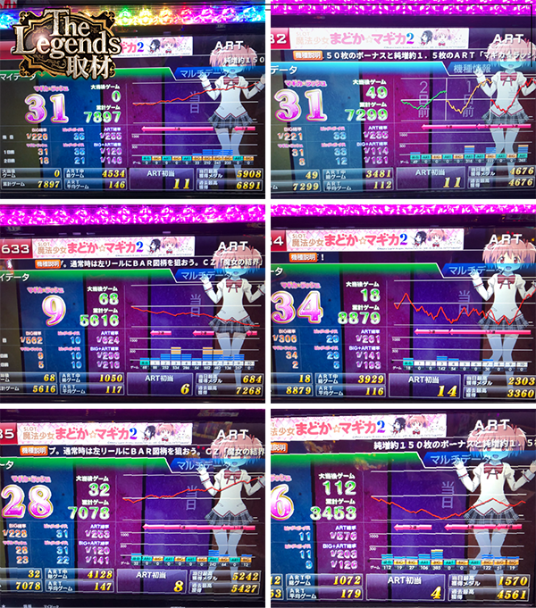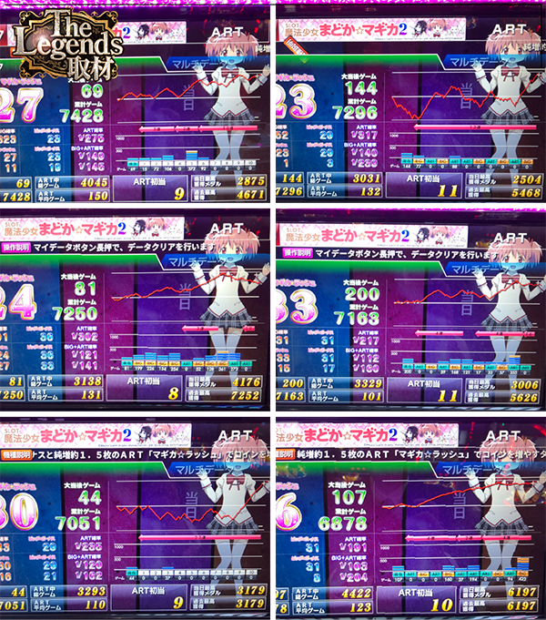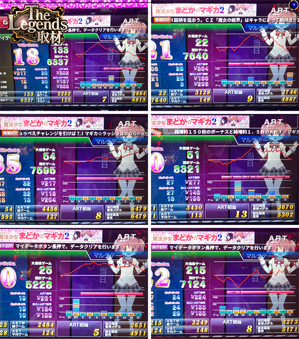 7箱アリ。6箱アリ。5箱アリ。4箱アリ(3台)。2箱アリ(4台)。最大7408枚獲得。最大5799枚獲得。最大5142枚獲得