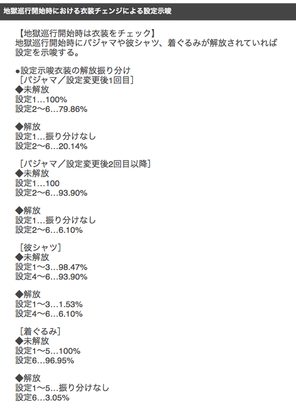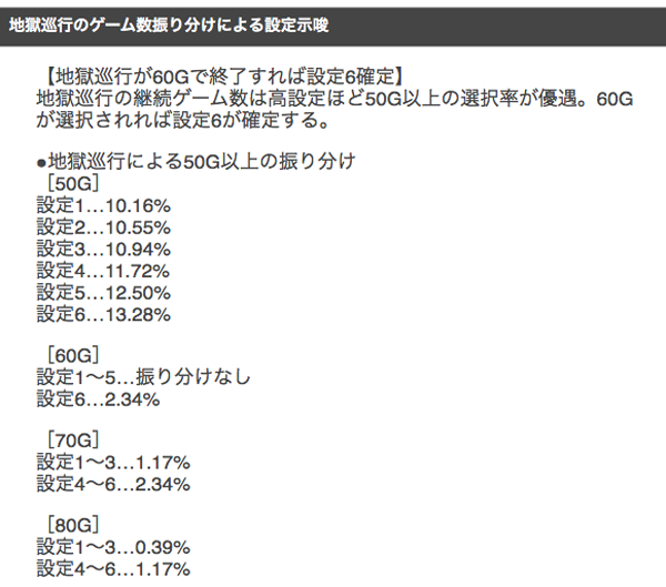 地獄巡行は設定によってゲーム数の選択率が異なり、60Gならば設定6が濃厚となる。開始時に選択できる衣装のパターンもしっかりと確認しておこう。