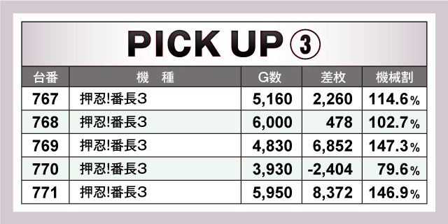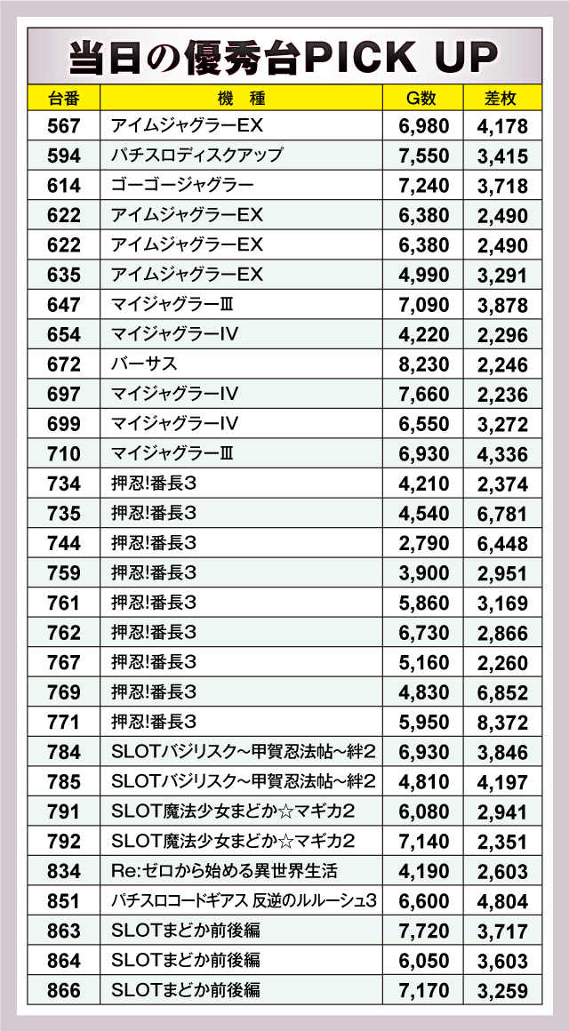 優秀台といえばやはり『押忍!番長3』。+8,372枚をマークした772番台を筆頭に、+6,852枚の769番台、+6,781枚の735番台、+6,448枚の744番台とズラリ。それに『SLOTバジリスク〜甲賀忍法帖〜絆2』、『SLOT劇場版 魔法少女まどか☆マギカ[前編]始まりの物語/[後編]永遠の物語』、『パチスロコードギアス 反逆のルルーシュ3』などが続いた。