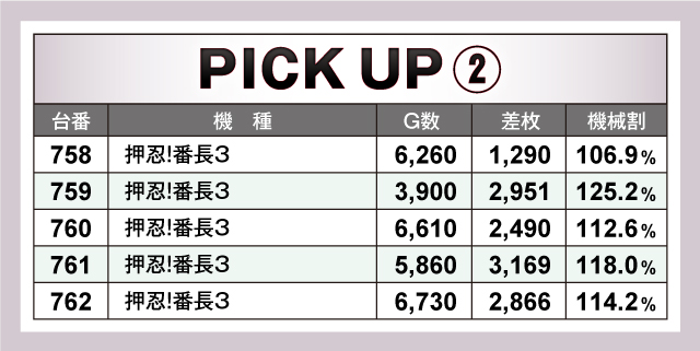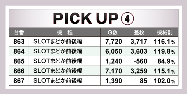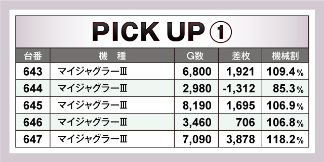 ピックアップ機種では、前述の『番長3』。『まどか前後編』に加え、『マイジャグラーⅢ』が素晴らしい結果を残していた。