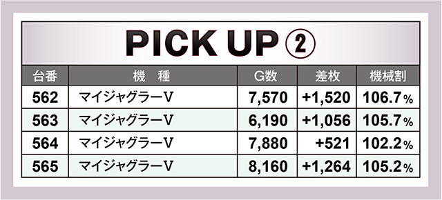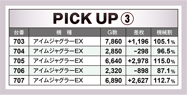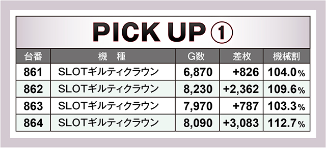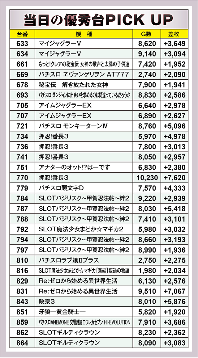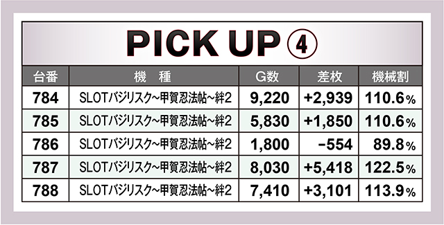 他店ではおそらく優秀台に期待できそうな『SLOTギルティクラウン』が、4台連続プラスに。さらにボーナス合算値の良好な台が多かった『アイムジャグラーEX』や『マイジャグラーⅤ』、極めつけは5台並びで3台が2,000枚オーバーを達成した『SLOTバジリスク~甲賀忍法帖~絆2』だろう。