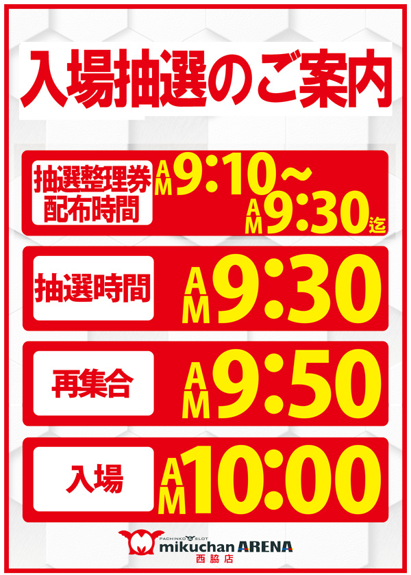 9:30~9:45まで抽選整理券配布 9:45抽選開始 |