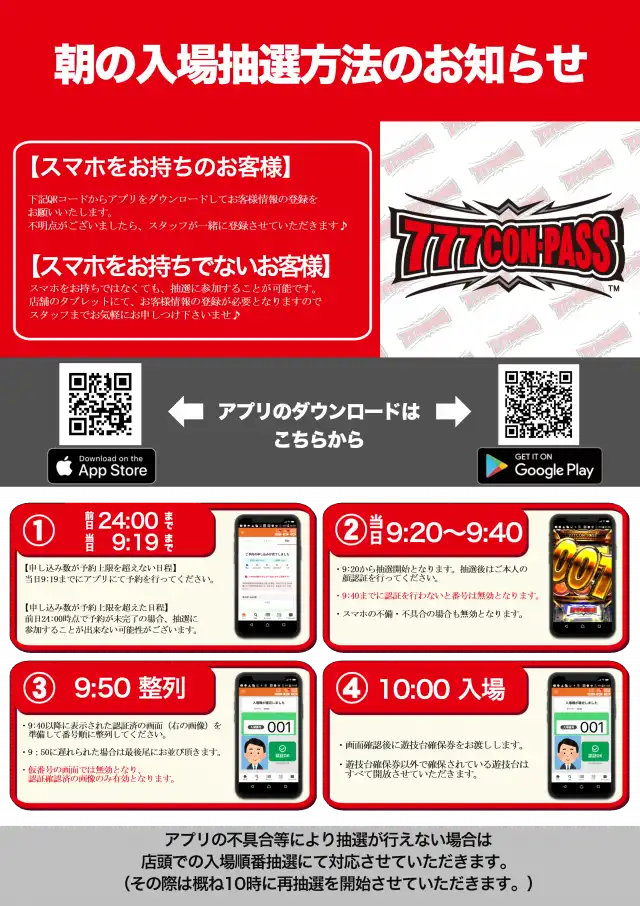 スマホアプリ【777CON-PASS】で入場抽選。並ばなくてもOK!!予約ができる!!アプリがなくても、店頭で予約・抽選が可能です。詳しくは当店スタッフにお気軽にお問合せください。 |
