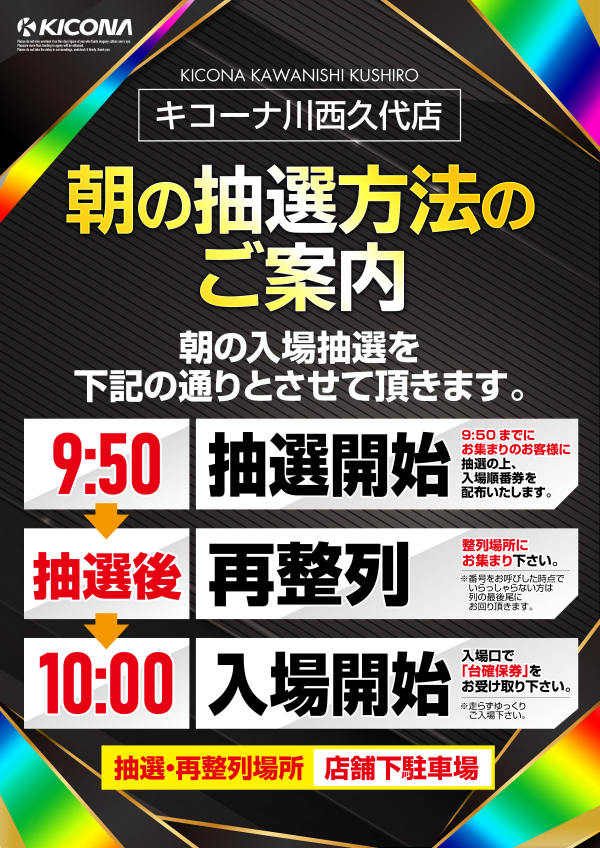 09:50 抽選開始 10:00 入場開始 ※日程により抽選時間の変更がございます |