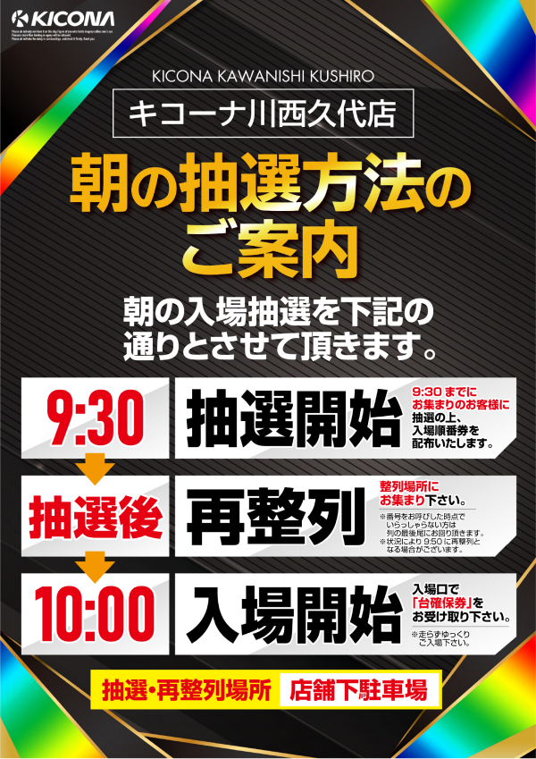09:50 抽選開始 10:00 入場開始 ※日程により抽選時間の変更がございます |