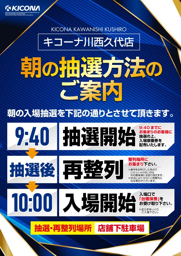 09:50 抽選開始 10:00 入場開始 ※日程により抽選時間の変更がございます |