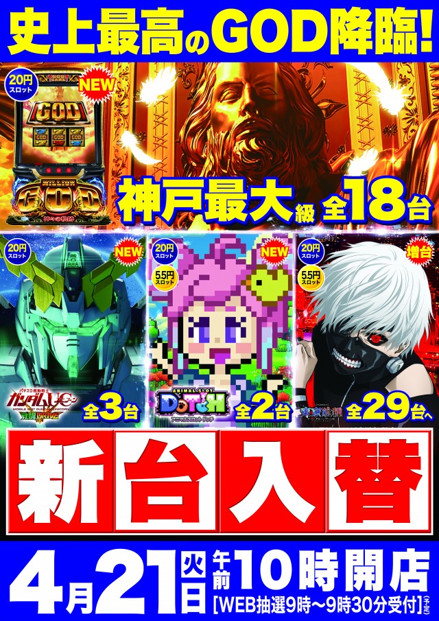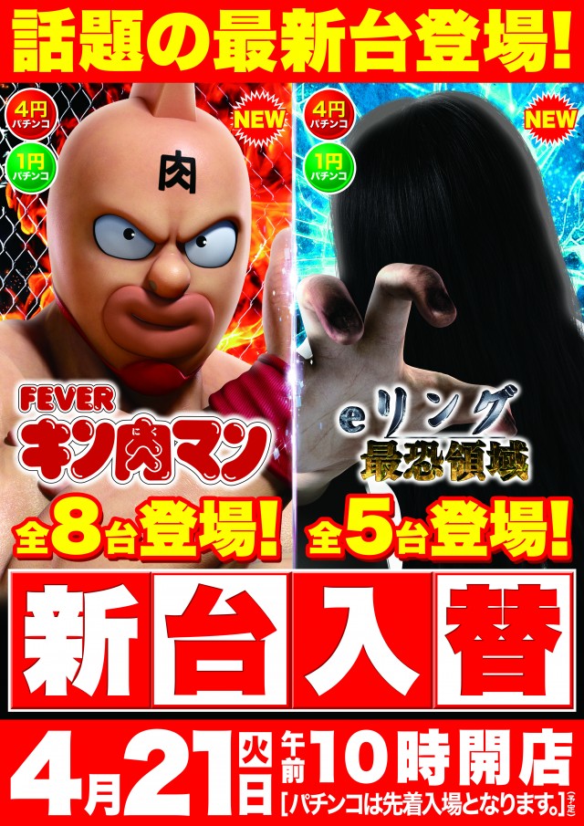 4月20日(月)新台入替準備の為、店休日とさせて頂きます。