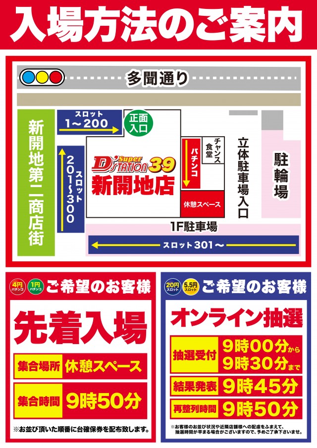 スロット入場抽選はWEB抽選に変更しました。抽選受付時間9:00~9:30 |