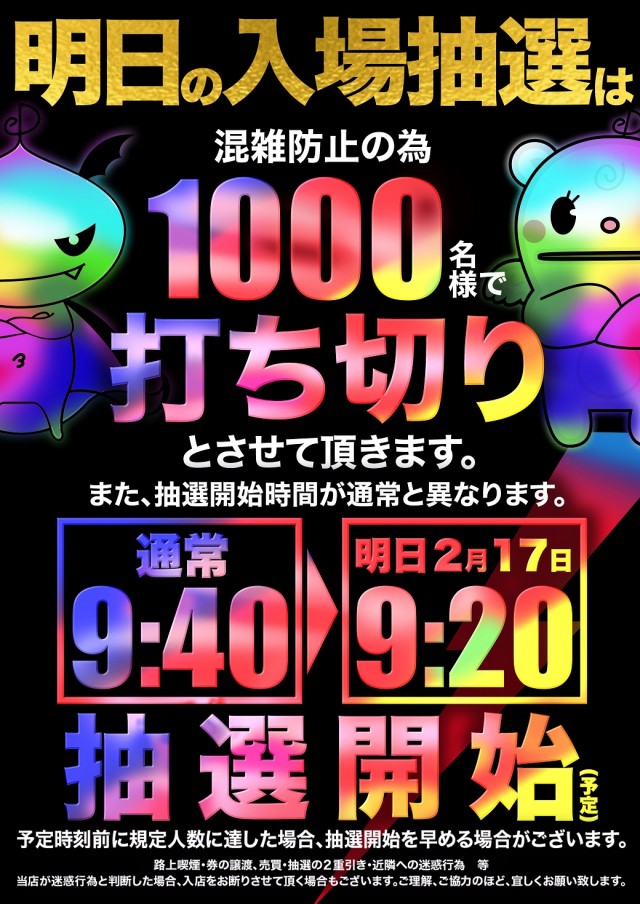 混雑防止の為入場抽選は1000名様打ち切り、9:20抽選開始