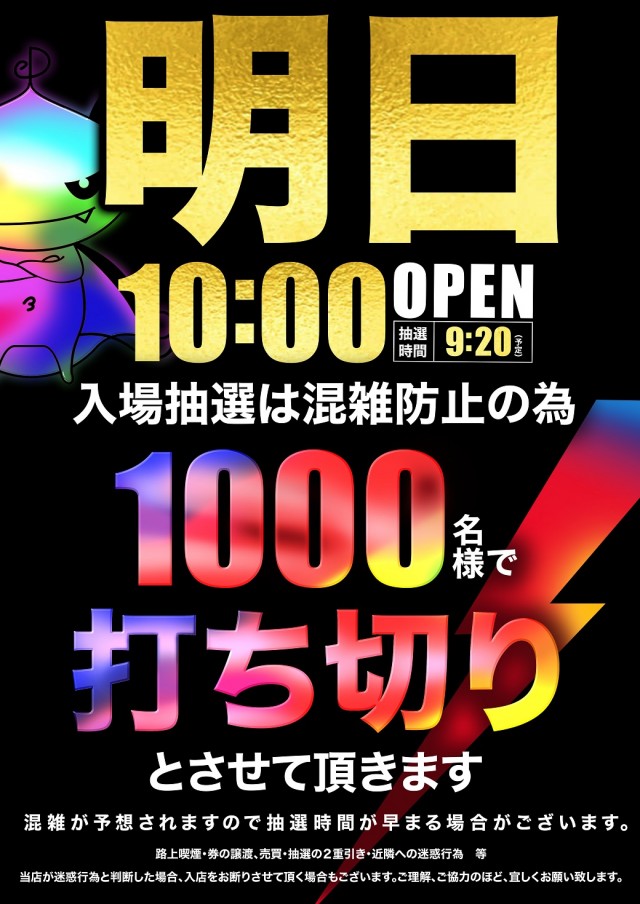 スロット入場抽選はWEB抽選に変更しました。抽選受付時間9:00~9:30 |