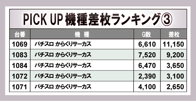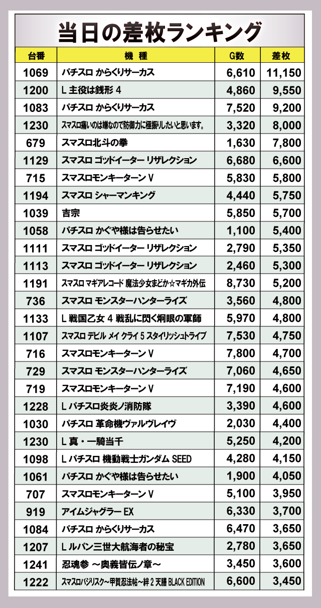 万枚OVER台が発生した『パチスロ からくりサーカス』の活躍が目立つ一方で、『スマスロ モンスターハンターライズ』は設置台数13台中9台がプラス差枚で終了しており、大きな熱気を放っていた。その他の機種も4桁プラス台続出という好調さを披露していることから、幅広い機種でチャンスが隠されていたようだ!