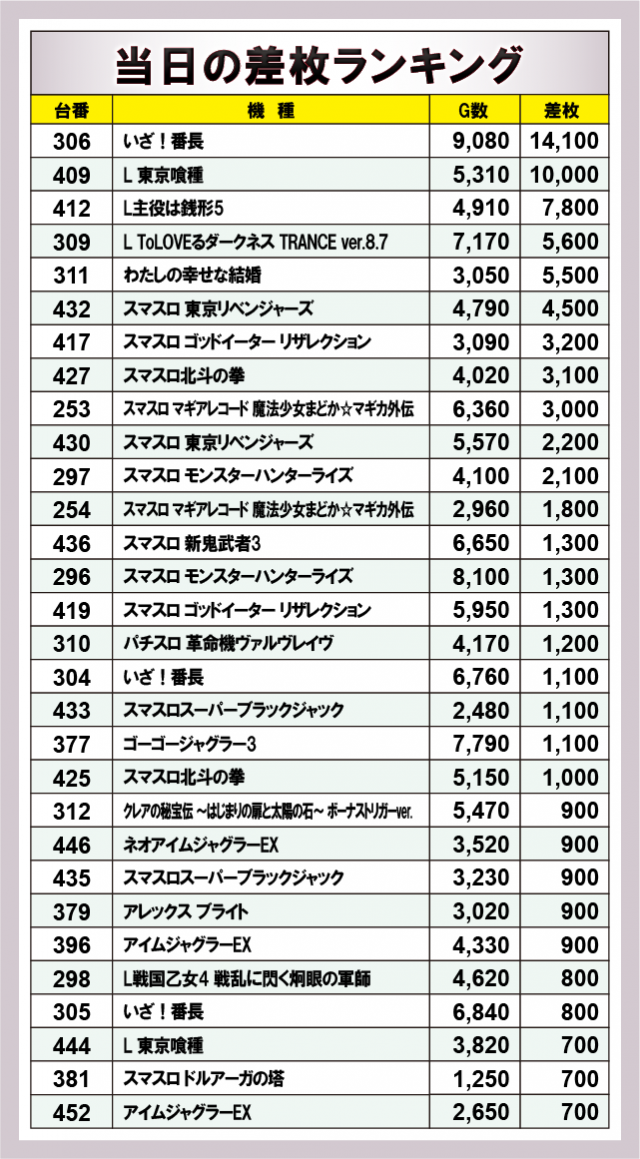 ※差枚数順に掲載しています