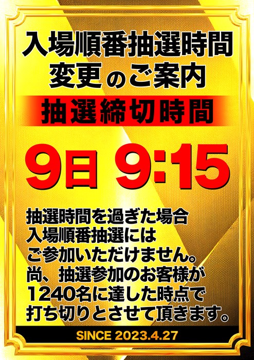 入場順番抽選時間【9時30分開始】※抽選時間が変更になる場合もございます。 |