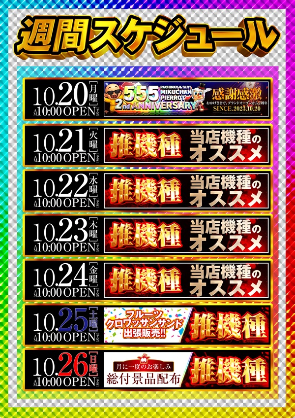 1位 10月20日(月) 2位 10月19日(日) 3位 10月10日(金)