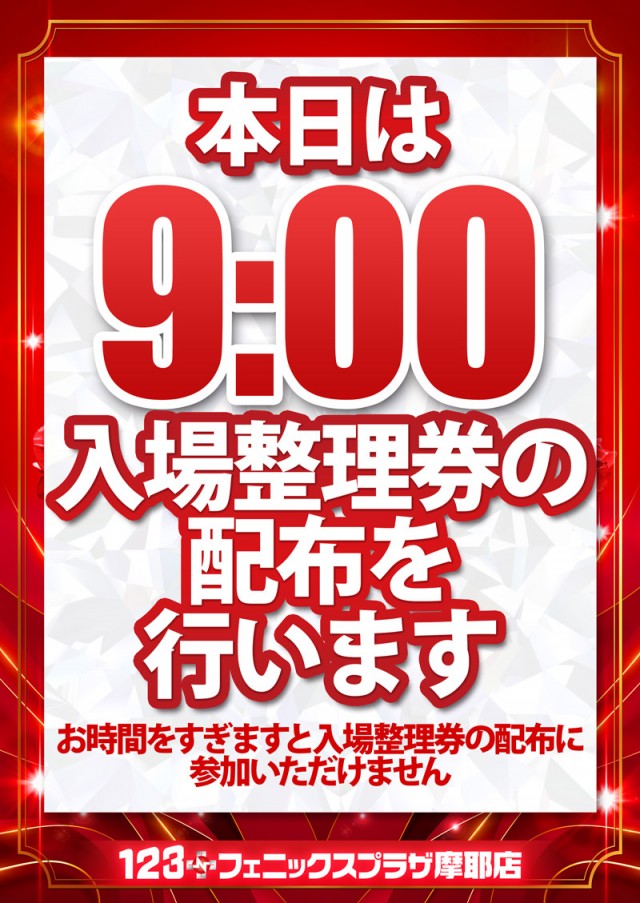 9:30より店舗立体駐車場5Fにて配布致します。(配布時間は変更になる場合が御座いますので詳細は最新情報をご覧下さい。) |
