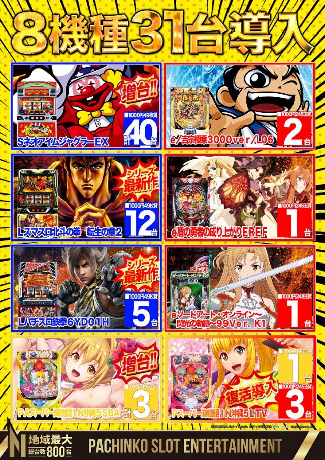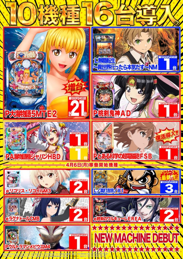 [1000円245玉] パチ:360台 [1000円980玉] パチ:160台 [1000円49枚] スロ:280台 |
