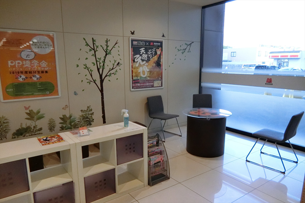 やわらかいタッチでカベに草木が描かれ、落ち着きのある空間となっているレストスペースにも注目。