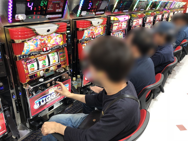 さて、再びスロットコーナーに戻り、定番のジャグラーシリーズの島に突入すると、「マイジャグラーⅣ」を始めとし、全台フル稼働で楽しむユーザーを多数目撃する事が出来た。