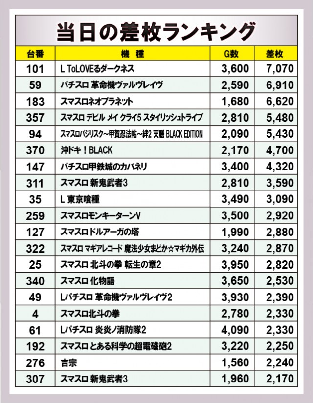 ※差枚数順に掲載しています