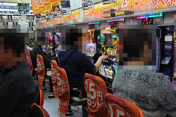 14時を過ぎる頃、パチンコでは1.25円パチンコの「ぱちんこ 新鬼武者」や「CRドラムロイド」が大活躍。遊技を楽しむプレイヤーの笑顔も明るい。