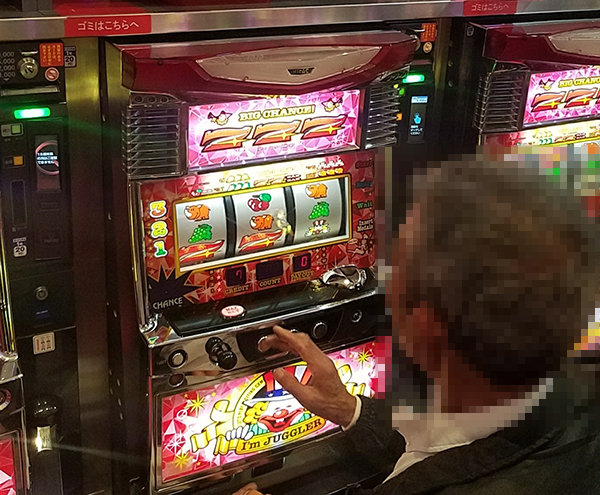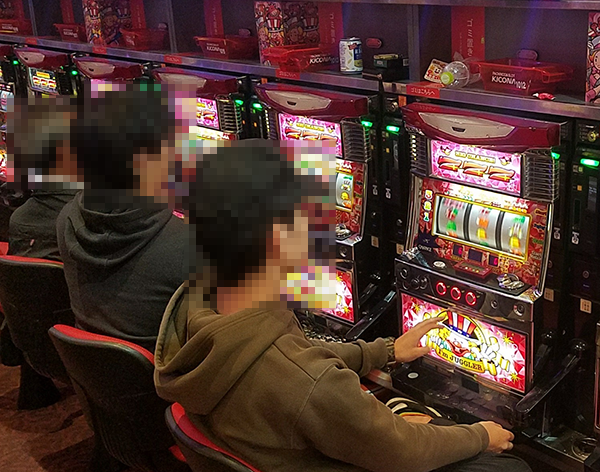 パチスロコーナーの台の上は、ゴミを置くスペースが設けられているほどに広い。バッグなどを置いているプレイヤーも確認している。