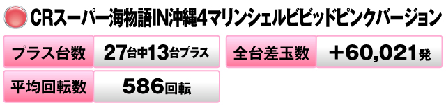 27台中13台がプラスで全台差玉数は+60,021発を記録した。