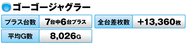 7台中6台がプラスで全台差枚数が+13,360枚、平均G数は8,026Gをマークした。