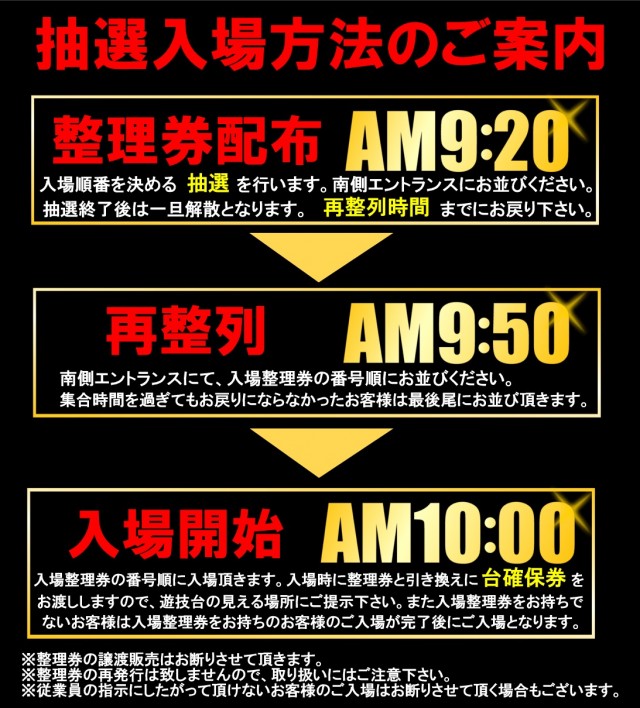 店頭にて抽選または混雑が予想される日については近隣への迷惑を配慮し777コンパスを用いての抽選とさせて頂きます。 |