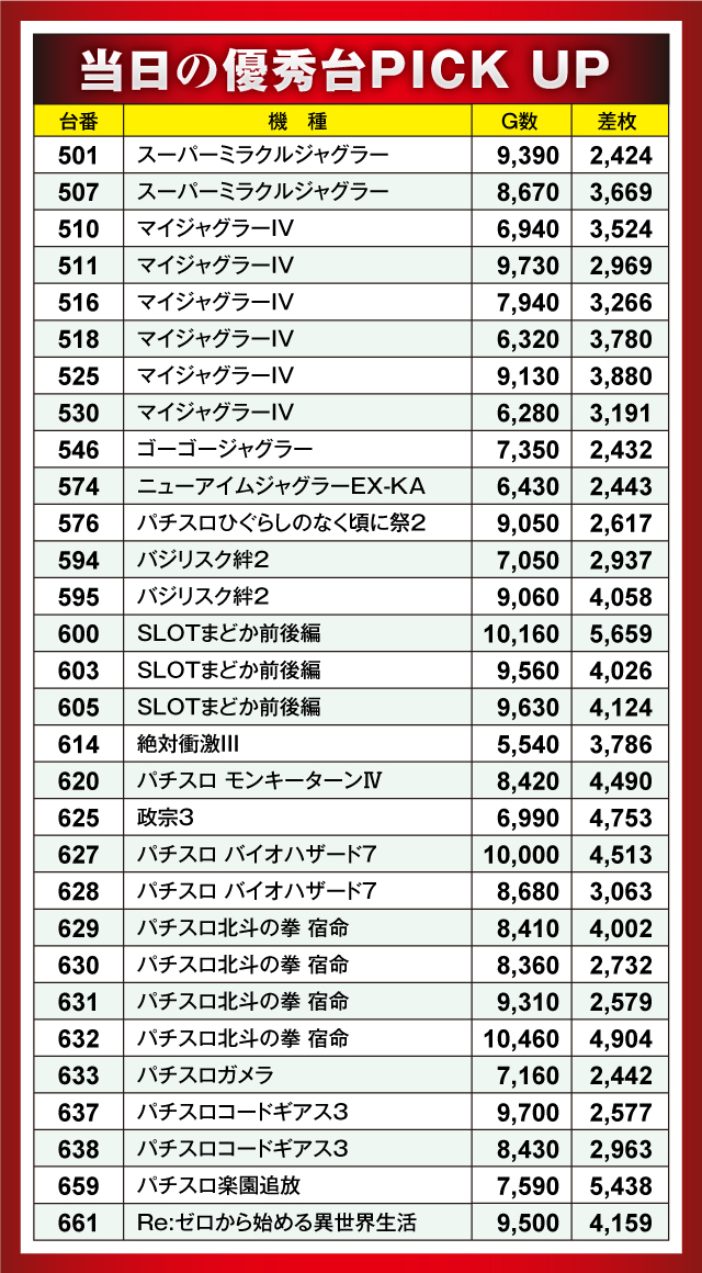 人気の『ジャグラー』シリーズをはじめ、様々な機種から3,000枚オーバー記録が誕生。特に5,000枚超えを達成した『魔法少女まどか☆マギカ[前編]始まりの物語/[後編]永遠の物語』『パチスロ楽園追放』は称賛に値する活躍であった。