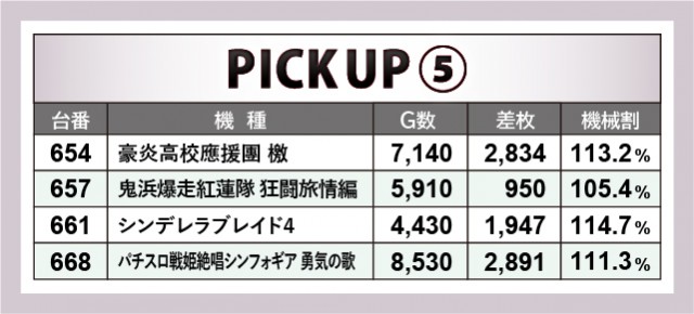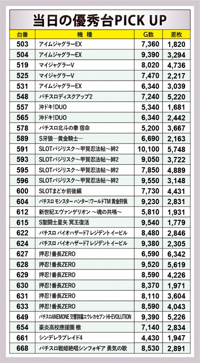 優秀台をチェックすると、『SLOTバジリスク~甲賀忍法帖~絆2』や『押忍!番長ZERO』といったメイン機種から+5千枚オーバーが発生。同店の看板機種として活躍する両機種は、ファンによってガッツリと遊技されていた。それは『パチスロディスクアップ2』『パチスロANEMONE 交響詩篇エウレカセブン HIーEVOLUTION』も同様で、幅広い機種群が店内の盛り上がりをリードしていたことが分かる。また3台構成の機種群についても1台以上の優秀台が存在しており、様々な機種で遊びたいファンの気持ちに配慮した同店の気概が見られた。