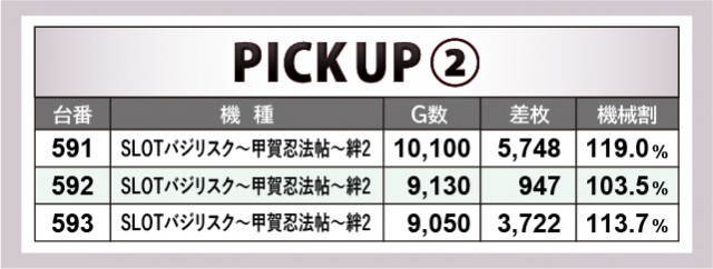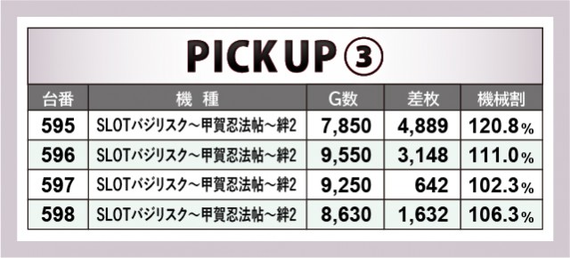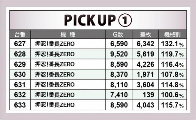 『押忍!番長ZERO』をピックアップすると、優秀台が横並びになっていることが分かる。627~633番台で想像以上の結果が記録されており、+5千枚オーバーが隣り合っている状況を見れば、当時の状況が一目瞭然のはずだ。また『SLOTバジリスク~甲賀忍法帖~絆2』も同様で、同じ機種を遊技するファンたちの喜々とした様子が想像にたやすい。