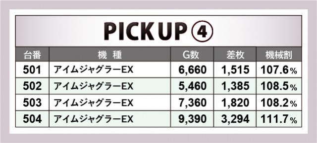 ノーマルタイプの盛り上がりをけん引したのは『アイムジャグラーEX』。こちらでも501~504番台の横並びで優秀台が見られた。そしてタイアップ機がメインの「アニスロコーナー」では、各所に優秀台を発見することができる。『パチスロ戦姫絶唱シンフォギア 勇気の歌』や『豪炎高校應援團 檄』を筆頭に+3千枚に迫る勢いを披露し、同コーナーの盛り上げ役として大きな務めを果たした。