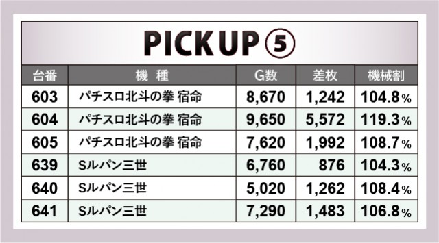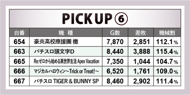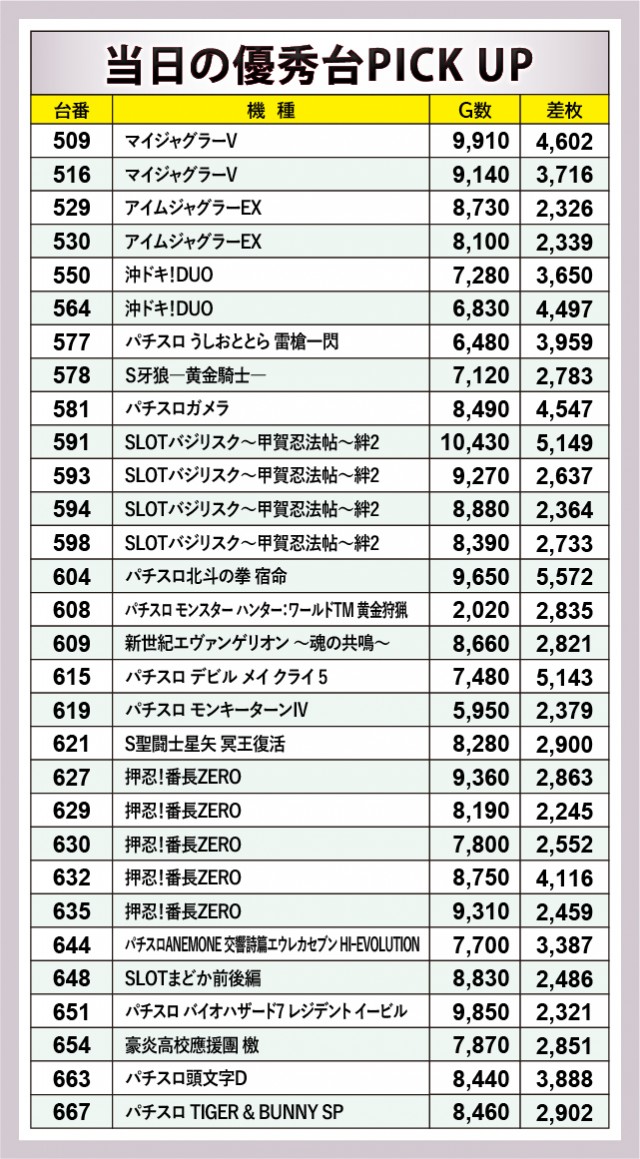 少数精鋭の『パチスロ北斗の拳 宿命』『Sルパン三世』も同様で、結果として全台プラス差枚をマークした。他の少数設置機種にも優秀台をできたため、同店の粋な計らいを感じずにはいられない。また名物エリア「アニスロコーナー」も目立った活躍を披露していた。『パチスロ頭文字D』では3千枚OVER、『パチスロ TIGER & BUNNY SP』『豪炎高校應援團 檄』は3千枚近くの差枚を記録し、コアなファンは恍惚の表情を浮かべていただろう。