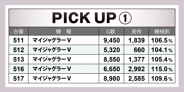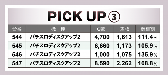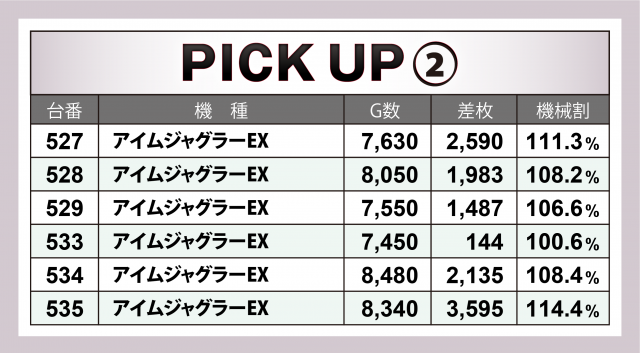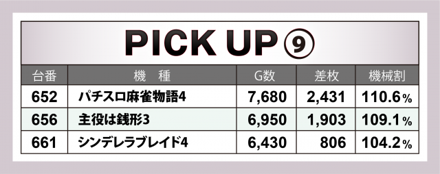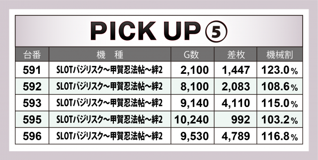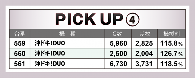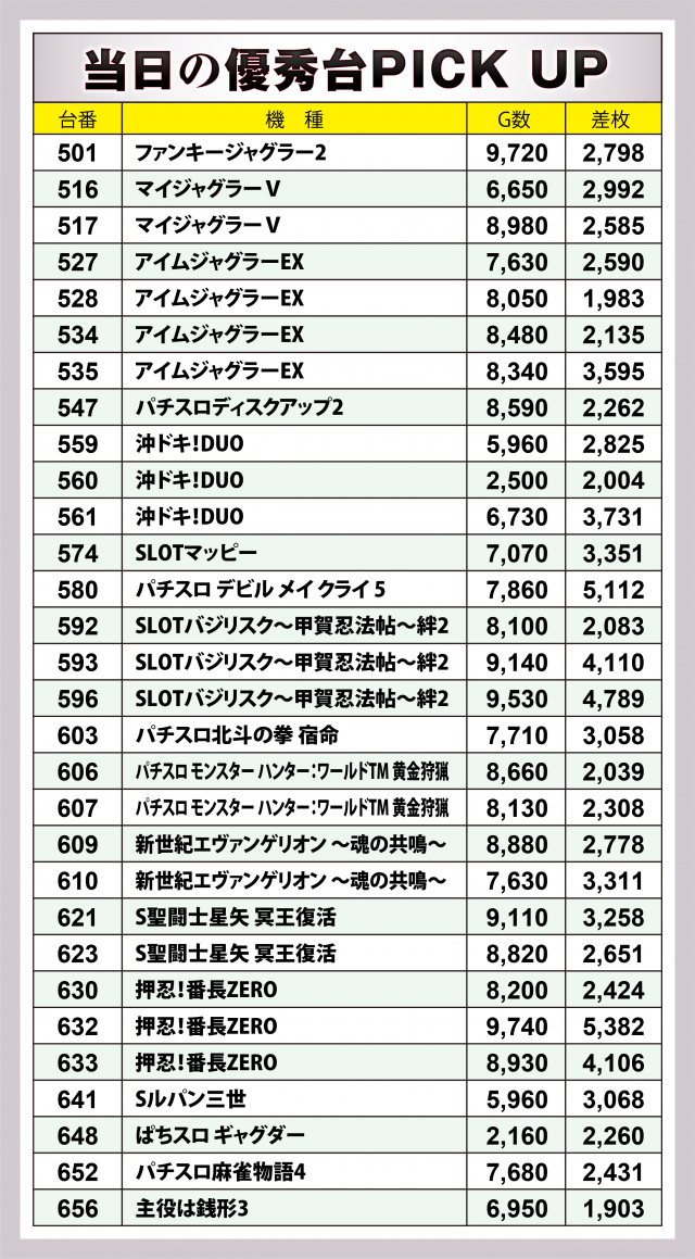 そしてこの日はなんと9か所の好況スポットが出現。横並びだけではなく歯抜け状態でも好調台が潜んでいたが、プレイヤーの察知により全37台がALLプラスを成し遂げた。中でも優秀だったのが3台平均+2千8百枚オーバーとなった『沖ドキ!DUO』、さらにそれより対象台数が各5台と多い中ほぼ同等の平均差枚数を残した『押忍!番長ZERO』(平均+2千8百枚弱)・『SLOTバジリスク~甲賀忍法帖~絆2』(平均+2千6百枚超)の2機種が躍進を果たした。