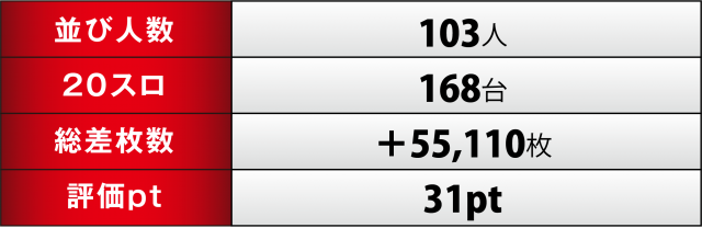 今回、[1000円/49枚] スロでは全台トータルで+55,110枚と絶好調、さらに評価pt数が31と過去回にも負けず劣らずの数値に。正直言って総設置数168台の店舗でこの差枚数と評価ptは信じ難いの一言。「ヒーローズレポート」に挑む勇者たちよ、「英雄」と化す近道はこの地が最も相応しいと言わざるを得ないのが現状、優秀な「狩り場」が姫路の地で誇らしげにアナタを待っている!