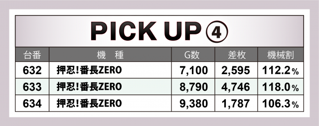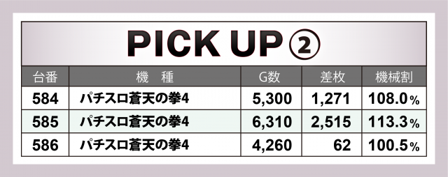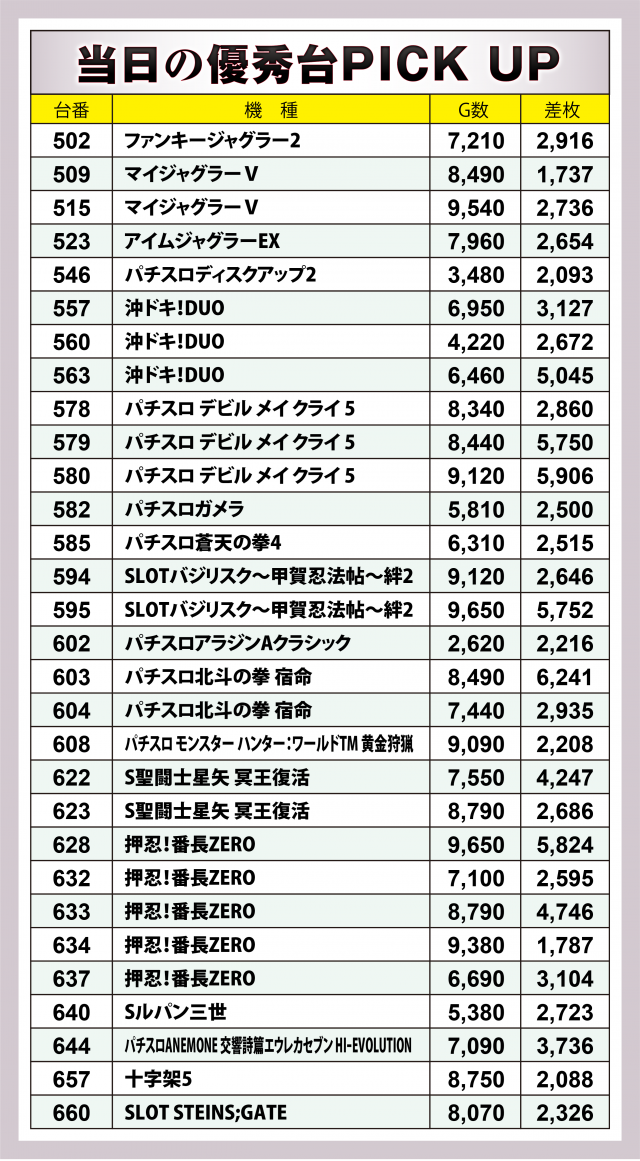 まずは優秀30台のPICK UPをチェック。うち28台が差枚数+2千枚以上、後述する横並び好況スポットを含めて+5千枚突破台が6台も産まれる結果となった。その横並びスポット以外では、+5千枚突破台を筆頭に3台合計で+1万枚オーバーとなった『沖ドキ!DUO』、2台トータルで+9千枚&うち1台は+6千枚を超えた『パチスロ北斗の拳 宿命』、2台合わせて+7千枚弱を記録した『S聖闘士星矢 冥王復活』の成績が光った。