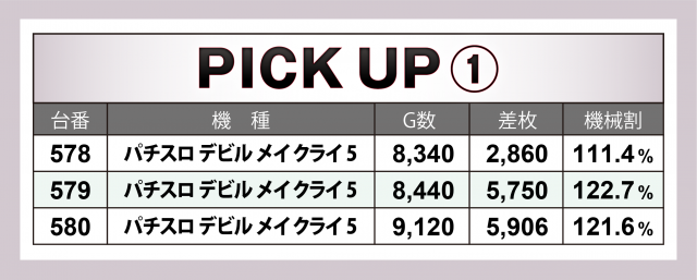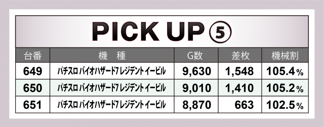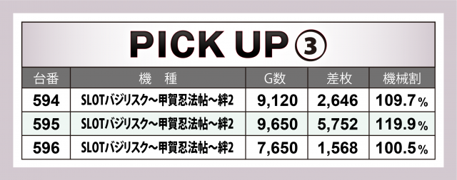 さらにこの日は横並び好況スポットが5箇所3台ずつ計15台が出現。直近2回と比べると台数と対象箇所も減ったが内容はハイクオリティ。全台が差枚数プラスをマーク、+5千枚クラスの台が『パチスロ デビル メイ クライ 5』では2、『押忍!番長ZERO』『SLOTバジリスク~甲賀忍法帖~絆2』では1ずつとなった。