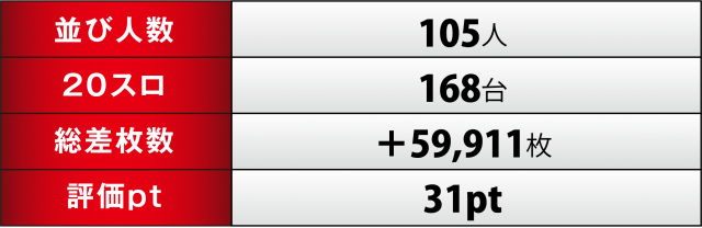 今回、[1000円/49枚] スロでは全台トータルで+59,911枚と前回を上回り、評価pt数は31と前回と同じく高い数値を維持。全8回の取材でただの一度もマイナスを喫したことがないという事実は驚異的の一言。もし、「最近勝てなくて困っている」という読者の方がいれば、同店に一歩足を踏み入れてみるのが勝利への近道ではなかろうか。その日が「英雄」取材の日なら…プラス収支はもう確実!?
