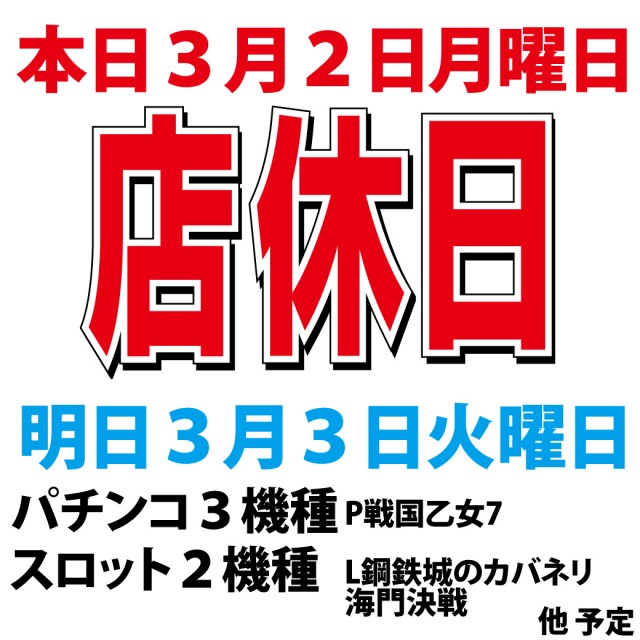 本日3月2日月曜日お休みを頂きますm(_ _)m