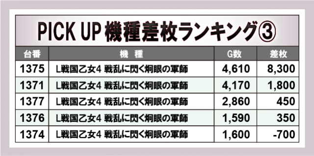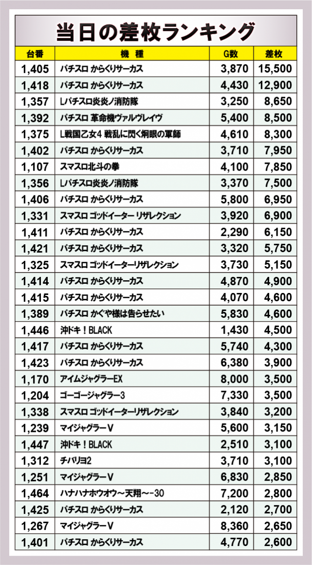 『パチスロ からくりサーカス』から2台の万枚台が発生し、店内の盛り上がりを大きくリードする存在となっていた。 さらに『Lパチスロ炎炎ノ消防隊』『パチスロ 革命機ヴァルヴレイヴ』『L戦国乙女4 戦乱に閃く炯眼の軍師』で8,000枚OVERと追随する内容となっており、主要スマスロ機たちの活躍が目立った。また、『沖ドキ!BLACK』や『ジャグラー』シリーズも多数ランクインしており、スペック問わずあらゆる機種にチャンスが隠されていたようだ!