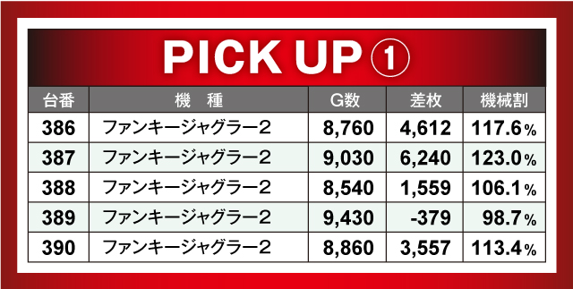 上記の優秀台PICK UP表を見てお分かりの通り、横並びで好成績を収めていたのが5機種。『ファンキージャグラー2』では差枚数プラス6千枚の台も生まれた当日、横並び好調スポットを順次確認していこう。