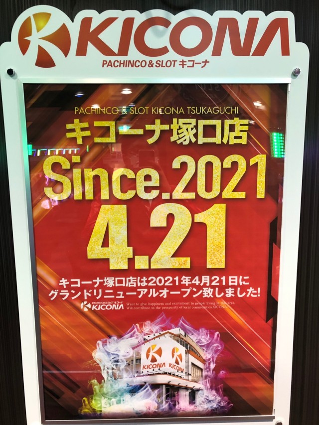 パチンコ304台・パチスロ128台併設の中規模店舗で、2021年4月にグランドリニューアルオープンを果たしており、当日はちょうど3か月を経たところ。