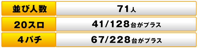 4パチ228台中67台がプラス、トータル差玉数は+28,956発と勝利に成功。
