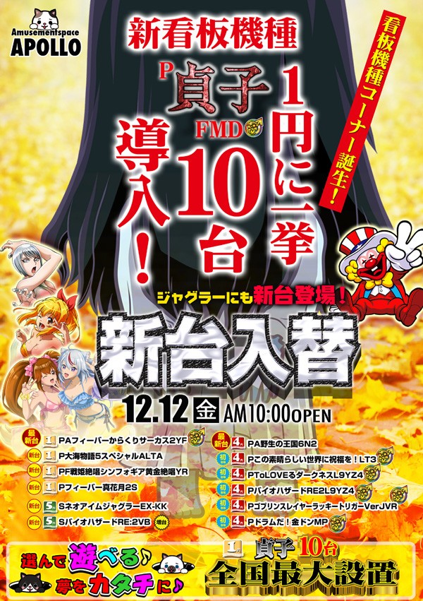 新看板機種登場!今年最後の新台入替 12月12日10時開店♪