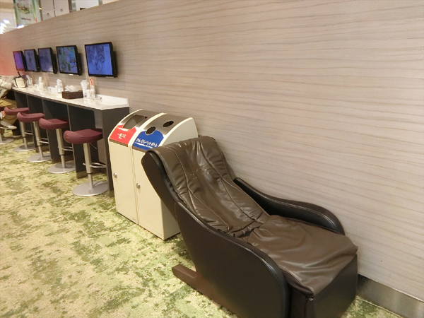 無料ロッカー・おしぼり・マッサージチェア・Caféコーナー・クッション・消臭スプレーなど、サービス面の充実ぶりも好印象に映った。