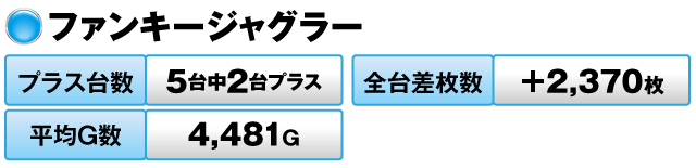 『ガメラ』は2台中両方がプラス台、両機種の稼働は6,000G~7,000Gクラスと高く、両機種の全台差枚数は+4,000枚を突破した。